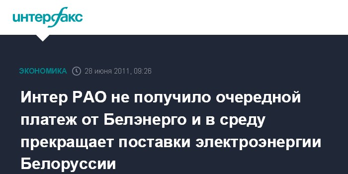 Москва. 28 июня. INTERFAX.RU - ОАО "Интер РАО ЕЭС" во вторник не дождалось перечисления очередного транша в рамках выплаты задолженности за поставки электроэнергии со стороны "Белэнерго" и готово прекратить поставки в ночь на 29 июня.