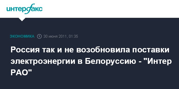 Москва. 30 июня. ИНТЕРФАКС - ОАО "Интер РАО ЕЭС" не возобновила поставки электроэнергии в Белоруссию с 00:00 мск 30 июня как планировалось накануне, сообщил "Интерфаксу" представитель компании Антон Назаров.