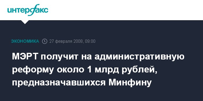 Москва. 27 февраля. INTERFAX.RU - Министерство экономического развития и торговли РФ получит на проведение административной реформы в 2008 году около 1 млрд рублей, первоначально предназначавшихся Минфину.