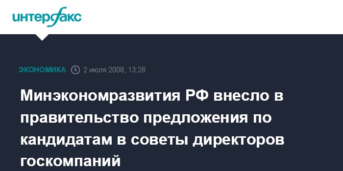Москва. 2 июля. INTERFAX.RU - Министерство экономического развития внесло в правительство предложения по кандидатам, которые будут входить в советы директоров компаний со стопроцентным государственным участием, заявил журналистам помощник президента РФ Аркадий Дворкович.