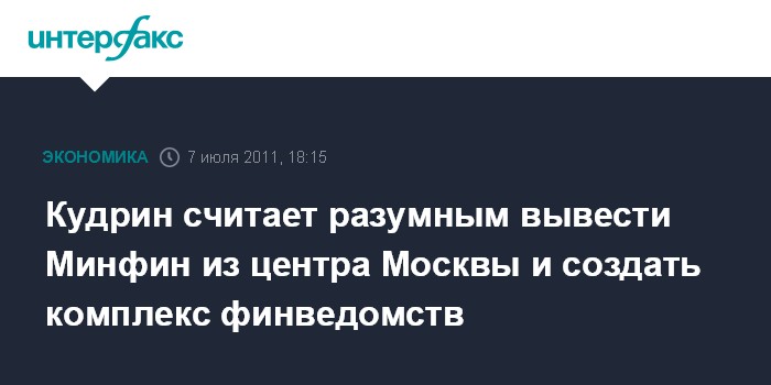 Москва. 7 июля. INTERFAX.RU - Министр финансов РФ Алексей Кудрин считает разумным переезд министерства финансов из центра Москвы и создание в одном месте комплекса финансовых ведомств.