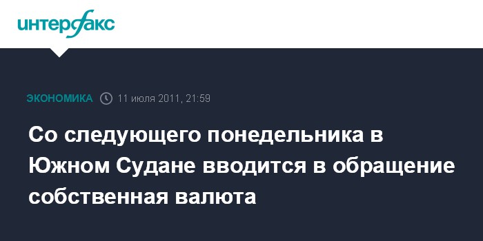 Лондон. 11 июля. INTERFAX.RU - Власти Южного Судана, самого молодого общепризнанного государства в мире, объявили о введении в обращение со следующей недели собственной валюты - фунта, сообщает в понедельник британская телерадиокорпорация Би-би-си.