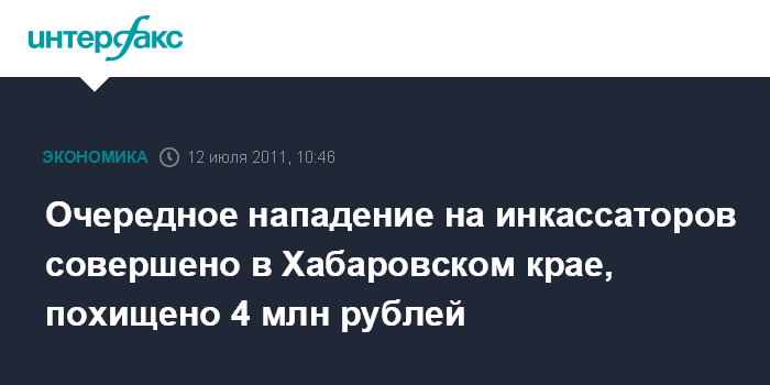 Хабаровск. 12 июля. INTERFAX.RU - В Комсомольске-на-Амуре (Хабаровский край) ограблены инкассаторы, перевозившие 4 млн рублей, сообщил агентству "Интерфакс - Дальний Восток" во вторник источник в правоохранительных органах региона.