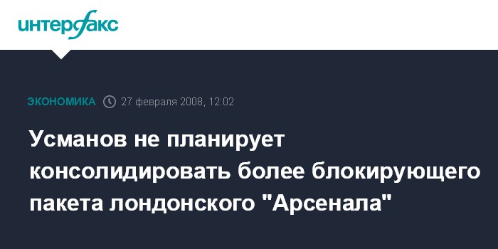 Москва. 27 февраля. INTERFAX.RU - Российский предприниматель, основной владелец холдинга "Газметалл" Алишер Усманов и его давний бизнес-партнер Фархад Мошири не планируют консолидировать более блокирующего пакета акций лондонского футбольного клуба "Арсенал".