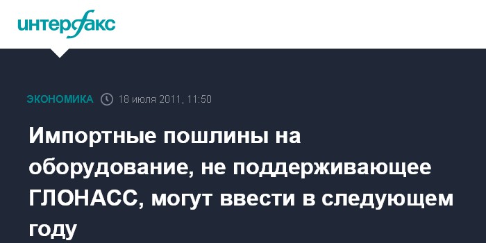 Москва. 18 июля. INTERFAX.RU - Импортные пошлины на ввоз оборудования, не поддерживающего спутниковую систему ГЛОНАСС, могут быть введены с 1 января 2012 г., сообщил журналистам вице-премьер РФ Сергей Иванов в понедельник в Москве.