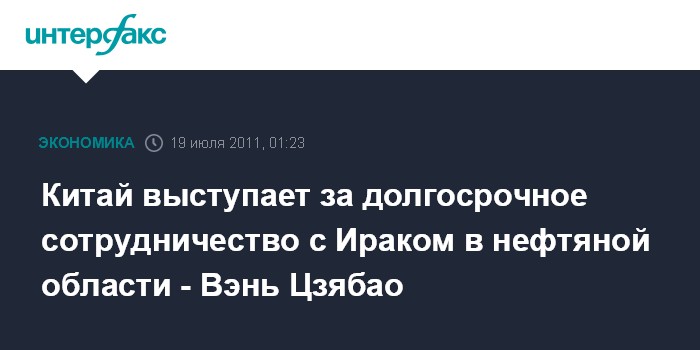 Пекин. 19 июля. ИНТЕРФАКС-КИТАЙ - Премьер Госсовета КНР Вэнь Цзябао заявил в минувший понедельник, что Китай готов к развитию сотрудничества с Ираком в нефтегазовой сфере на долгосрочной основе, говорится в сообщении, опубликованном на сайте МИД КНР.