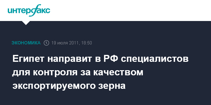 Москва. 19 июля. INTERFAX.RU - Египет намерен направить в Россию специалистов для того, чтобы контролировать качество отправляемого в его адрес российского зерна.