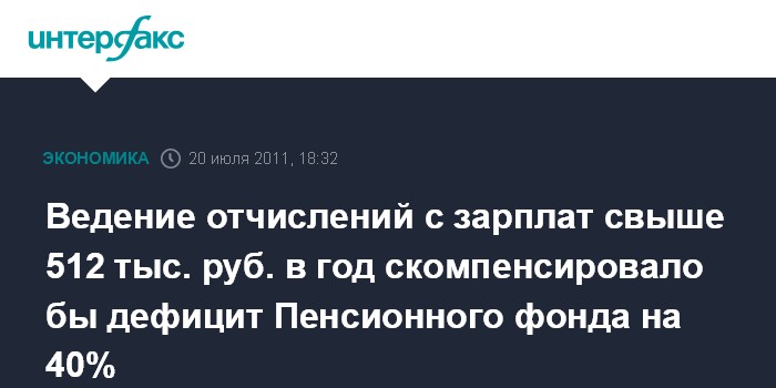 Москва. 20 июля. INTERFAX.RU - Бюджетный дефицит Пенсионного фонда России на 2012 год может быть компенсирован на 40% в случае, если в предстоящую осеннюю сессию Госдума РФ примет законопроект, предусматривающий введение 10-процентной ставки страхового взноса, облагающего годовой доход в размере свыше 512 тысяч рублей.