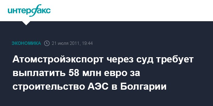 Москва. 21 июля. INTERFAX.RU - ЗАО "Атомстройэкспорт" подало иск в Международный арбитражный суд Международной торговой палаты в Париже к Национальной электрической компании Болгарии о взыскании 58 млн евро за выполненные работы по строительству АЭС "Белене".