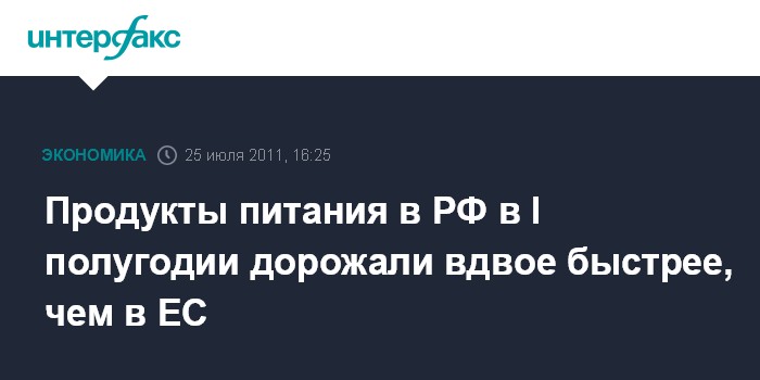 Москва. 25 июля. INTERFAX.RU - Рост цен на продукты питания в РФ в I полугодии 2011 года составил 4,9%, что в 2 раза превысило удорожание продовольствия в ЕС (2,4%), говорится в сообщении Федеральной службы госстатистики (Росстат).