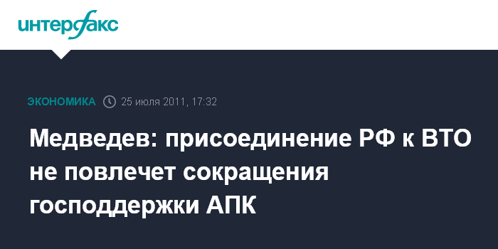 Медведев: присоединение РФ к ВТО не повлечет сокращения господдержки АПК