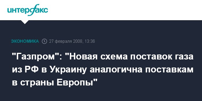 Москва. 27 февраля. INTERFAX.RU - Новая схема поставок газа на Украину, о которой две недели назад договорились лидеры двух стран, аналогична той, что используется при поставках российского газа во многие страны Европы, сообщил журналистам официальный представитель "Газпрома" Сергей Куприянов.