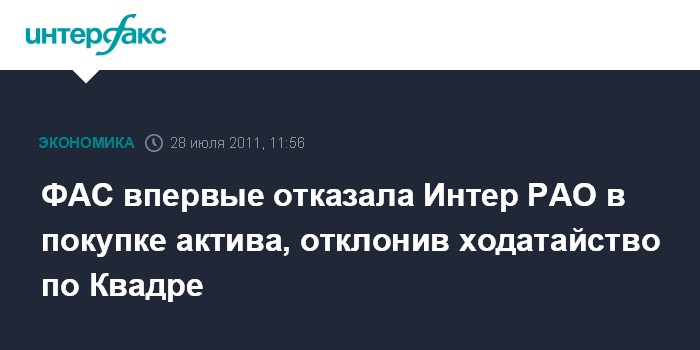 ФАС впервые отказала Интер РАО в покупке актива, отклонив ходатайство по Квадре