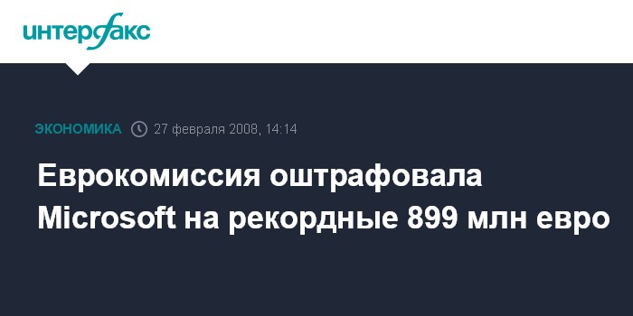 Брюссель. 27 февраля. INTERFAX.RU - Еврокомиссия оштрафовала Microsoft Corp. на рекордные 899 млн евро за невыполнение распоряжения антимонопольных органов от 2004 года, сообщило агентство Bloomberg.