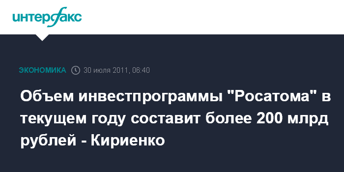 Воронеж. 30 июля. ИНТЕРФАКС-ЦЕНТР - Общий объем инвестиционной программы "Росатома" в текущем году составит более 200 млрд рублей, сообщил в пятницу на совещании в Нововоронеже глава "Росатома" Сергей Кириенко.