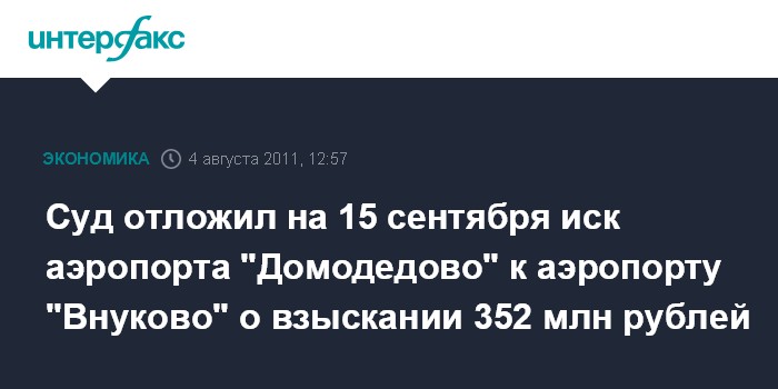Суд отложил на 15 сентября иск аэропорта "Домодедово" к аэропорту "Внуково" о взыскании 352 млн рублей