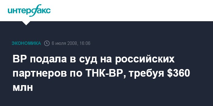 Москва. 6 июля. INTERFAX.RU - Британская BP PLC подала 30 июня иск в лондонский суд с требованием взыскать с российских партнеров по ТНК-BP более 8,4 млрд рублей ($360 млн), которые были уплачены совместной компанией по налоговым претензиям, относящимся к периоду до 2003 года, сообщает The Wall Street Journal.