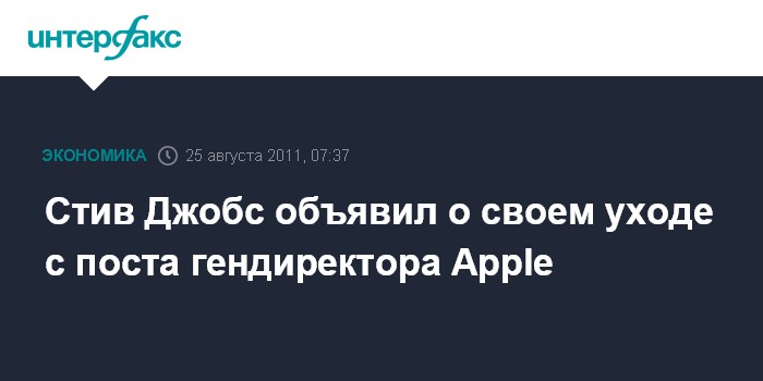 Москва. 25 августа. INTERFAX.RU - Бессменный на протяжении 18-ти лет лидер и сооснователь компании Apple Стив Джобс в четверг объявил о своем уходе с поста генерального директора, сообщает CNN.