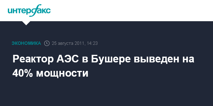 Москва. 25 августа. INTERFAX.RU - Ядерный реактор АЭС "Бушер" в Иране выведен на 40% от номинальной мощности, сообщила пресс-служба генподрядчика проекта ЗАО "Атомстройэкспорт" (АСЭ, Россия). Турбогенератор энергоблока АЭС работает сейчас на холостом ходу с показателем 3000 оборотов в минуту.