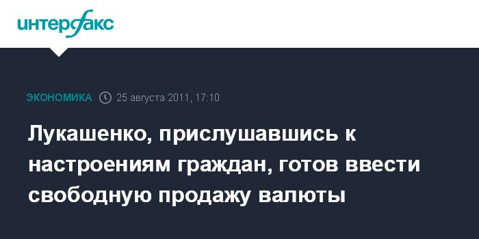 Минск. 25 августа. INTERFAX.RU - Президент Белоруссии Александр Лукашенко считает возможным в ближайшее время выход на единый обменный курс белорусского рубля и свободную продажу валюты.