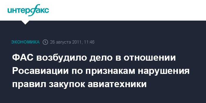 Москва. 26 августа. INTERFAX.RU - Федеральная антимонопольная служба (ФАС) России возбудила дело в отношении Росавиации по признакам нарушения правил проведения конкурса на поставку авиационной техники, говорится в сообщении ФАС.