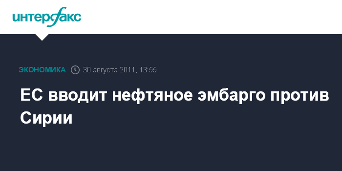 Вена. 30 августа. INTERFAX.RU - 27 стран-членов Европейского союза договорились о введении нефтяного эмбарго против Сирии, сообщила во вторник австрийская газета Die Presse со ссылкой на дипломатов в Брюсселе.