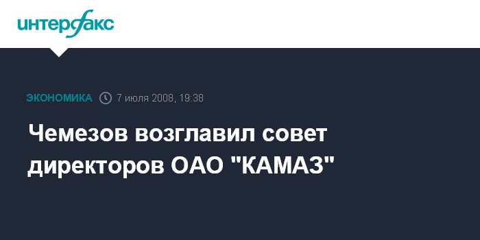 Москва. 7 июля. ИНТЕРФАКС-АВН - Глава Государственной корпорации (ГК) "Ростехнологии" Сергей Чемезов избран председателем совета директоров ОАО "КАМАЗ".