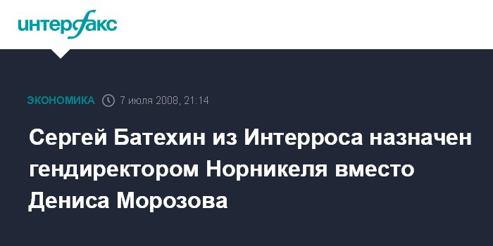 Москва. 7 июля. ИНТЕРФАКС - Сергей Батехин из холдинга "Интеррос" назначен генеральным директором ГМК "Норильский никель" (РТС: GMKN) вместо Дениса Морозова, сообщил журналистам представитель компании по итогам первого заседания совета директоров ГМК после годового собрания акционеров.