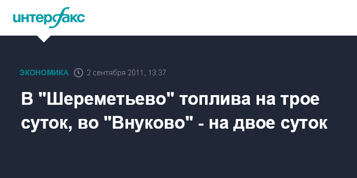 Москва. 2 сентября. INTERFAX.RU - Аэропорт "Шереметьево" располагает запасами авиатоплива на трое суток, во "Внуково" резерва авиа-ГСМ хватит на двое суток.