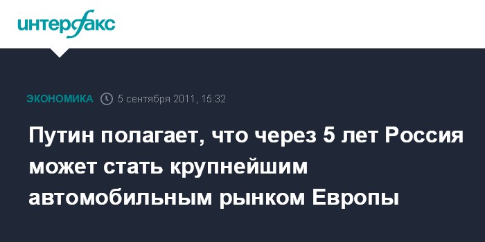 "По оценкам экспертов, уже в 2015-2016 годах российский автомобильный рынок способен стать крупнейшим в Европе. Так и будет, я в этом не сомневаюсь. У нас потенциалы роста очень большие", - сказал В.Путин на межрегиональной конференции партии "Единая Россия" в Череповце.