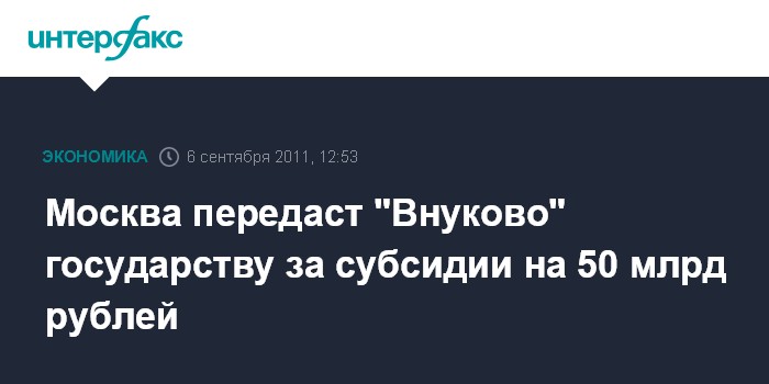Москва передаст "Внуково" государству за субсидии на 50 млрд рублей