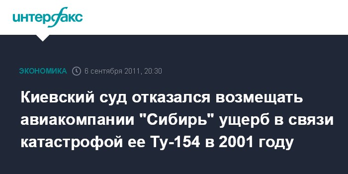 Киевский суд отказался возмещать авиакомпании "Сибирь" ущерб в связи катастрофой ее Ту-154 в 2001 году