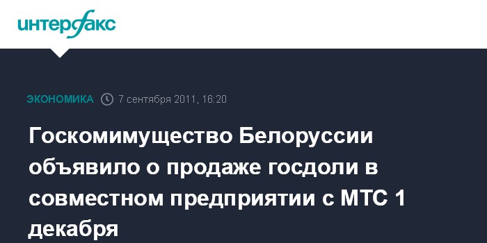 Минск. 7 сентября. INTERFAX.RU - Госкомитет по имуществу Белоруссии объявил о проведении 1 декабря 2011 года аукциона по продаже госдоли (51%) в уставном капитале СООО "Мобильные ТелеСистемы".