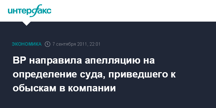 Москва. 7 сентября. INTERFAX.RU - BP Exploration Operating Company Limited (BP EOC) в среду направила апелляционную жалобу на определение Арбитражного суда Тюменской области от 30 августа 2011 года и обратилась к апелляционному суду с просьбой об отмене определения, говорится в сообщении компании.