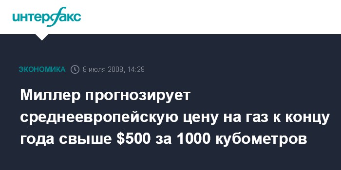 Москва. 8 июля. INTERFAX.RU - По прогнозам Газпрома, к концу 2008 г. среднеевропейская цена на газ превысит $500 за 1000 кубометров, сообщил глава компании Алексей Миллер. "Что касается цен на газ: ситуация складывается для конечных потребителей достаточно драматично. И, по нашим прогнозам, уже к концу 2008 г. среднеевропейская цена достигнет более $500 за 1000 кубометров", - сказал Миллер на рабочей встрече во вторник в Москве с премьер-министром РФ Владимиром Путиным.