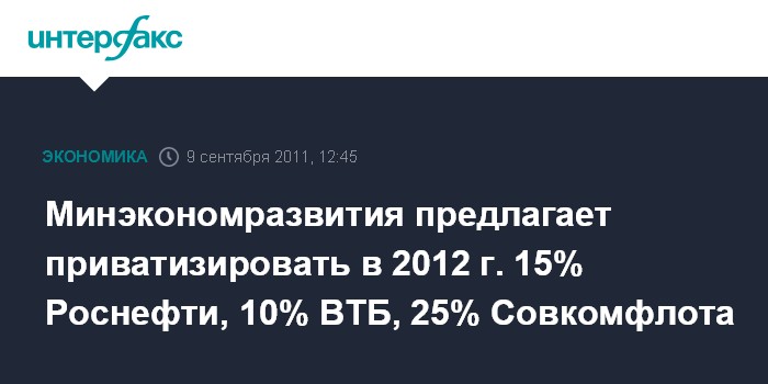 Москва. 9 сентября. INTERFAX.RU - Минэкономразвития предлагает приватизировать в 2012 г. до 15% "Роснефти" (РТС: ROSN), 10% ВТБ (РТС: VTBR), 25% "Совкомфлота", 4,11% минус одна акция ФСК ЕЭС и пакет "РусГидро" (РТС: HYDR), чтобы сохранить в ней 50% плюс одну акцию в госсобственности.