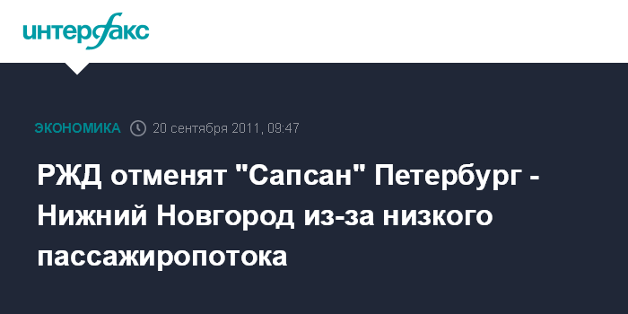 Москва. 20 сентября. INTERFAX.RU - ОАО "Российские железные дороги" (РЖД) с ноября планирует отменить "Сапсан" между Санкт-Петербургом и Нижним Новгородом, следовавший транзитном через Москву.