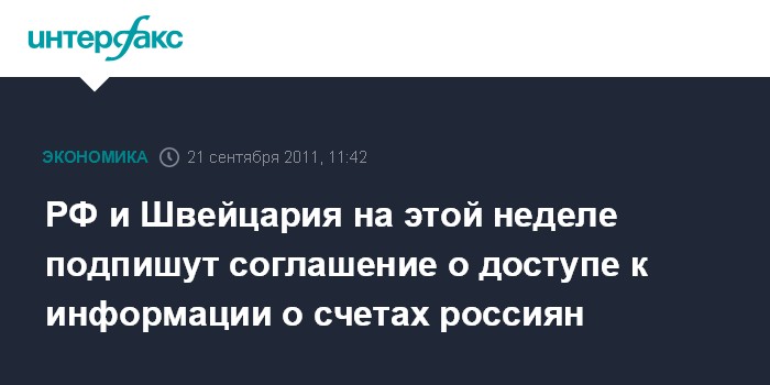Москва. 21 сентября. INTERFAX.RU - Россия и Швейцария до конца этой недели подпишут соглашение, предусматривающее предоставление информации о счетах российских граждан в швейцарских банках, сообщил вице-премьер, министр финансов РФ Алексей Кудрин, выступая в Госдуме в среду.