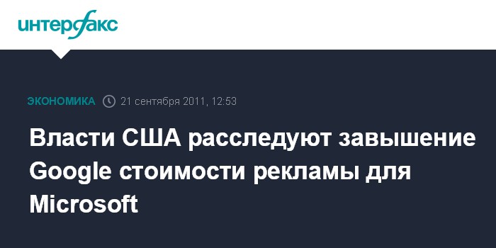 Нью-Йорк. 21 сентября. INTERFAX.RU - Антимонопольное ведомство США начало проводить расследование по обвинениям Google Inc. в незаконном завышении стоимости рекламы для конкурирующей Microsoft Corp. в 50 раз, сообщает агентство Bloomberg со ссылкой на информированные источники.