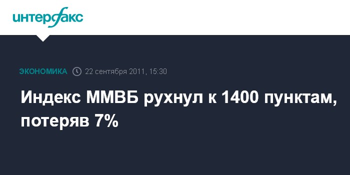 Москва. 22 сентября. INTERFAX.RU - Индекс ММВБ, один из основных российских фондовых индикаторов, в четверг рухнул в район 1400 пунктов, потеряв 7% на фоне обвального падения мировых площадок на новостях из США.