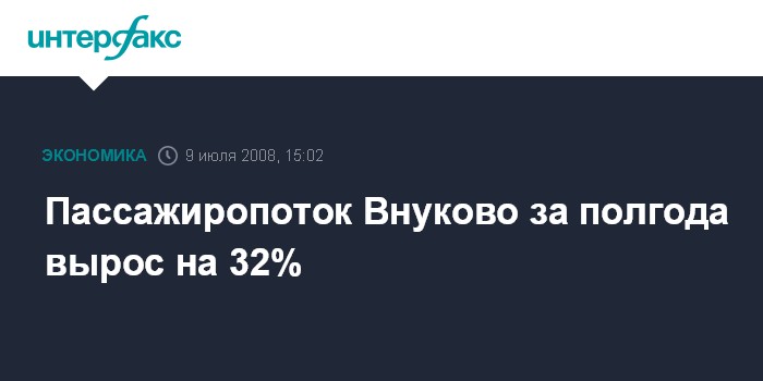 Москва. 9 июля. INTERFAX.RU - По итогам первого полугодия 2008 г. общий пассажиропоток международного аэропорта Внуково составил 3 миллионов 683 тысяч пассажиров, что на 32% больше, чем за аналогичный период 2007 г., сообщили в среду "Интерфаксу" в пресс-службе аэропорта.