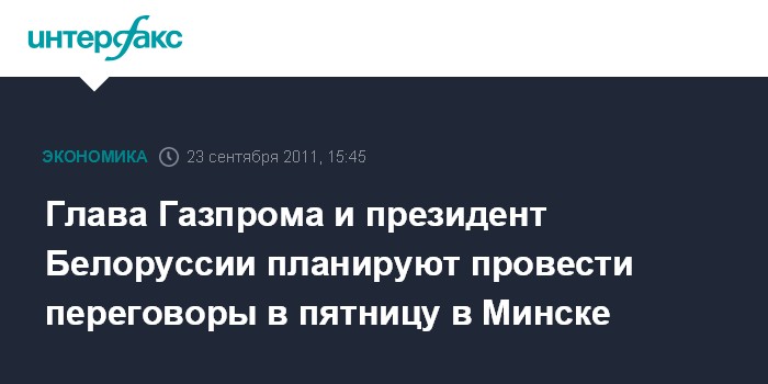 Москва. 23 сентября. INTERFAX.RU - Глава "Газпрома" Алексей Миллер и президент Белоруссии Александр Лукашенко планируют в пятницу провести переговоры в Минске, сообщил Агентству газовой информации (АГИ) источник, близкий к переговорам.