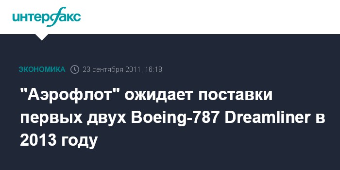 Москва. 23 сентября. INTERFAX.RU - ОАО "Аэрофлот - российские авиалинии" ожидает поставки первых двух Boeing-787 Dreamliner в 2013 года, сообщил журналистам в пятницу генеральный директор авиакомпании Виталий Савельев.