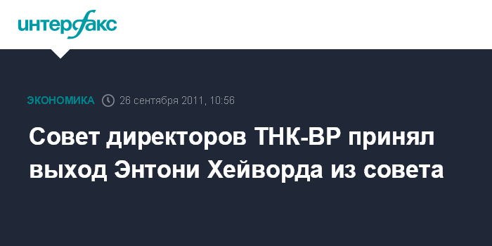 Москва. 26 сентября. INTERFAX.RU - Совет директоров ТНК-BP принял отставку экс-главы BP Энтони Хейворда из состава совета директоров ТНК-ВР, говорится в сообщении компании.