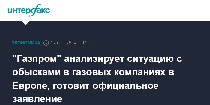 Москва. 27 сентября. ИНТЕРФАКС-АГИ - В "Газпроме" готовят заявление для печати в связи с обысками, проведенными представителями Еврокомиссии в офисах европейских компаний - импортеров газа.