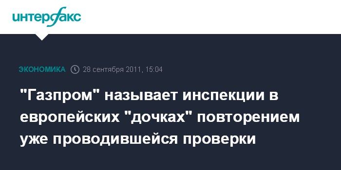 Москва. 28 сентября. INTERFAX.RU - "Газпром" заявляет, что неожиданные инспекции, прошедшие 27 сентября в офисах дочерних и зависимых компаний "Газпрома" в Центральной и Восточной Европе, а также в офисах некоторых европейских покупателей "Газпрома", по сути, являются повторением ранее проводимой проверки ряда европейских дочерних компаний "Газпрома".