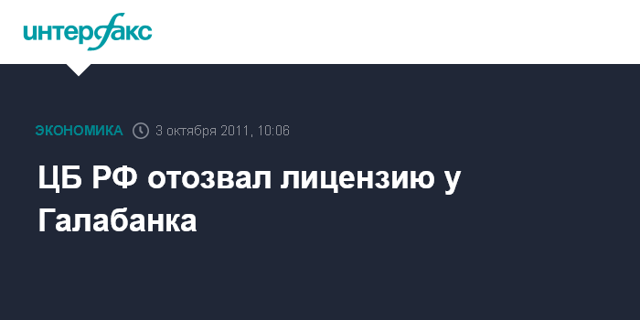 Москва. 3 октября. INTERFAX.RU - Банк России отозвал с 3 октября лицензию на осуществление банковских операций у ЗАО "АКБ "Галабанк", сообщил департамент внешних и общественных связей ЦБ РФ.