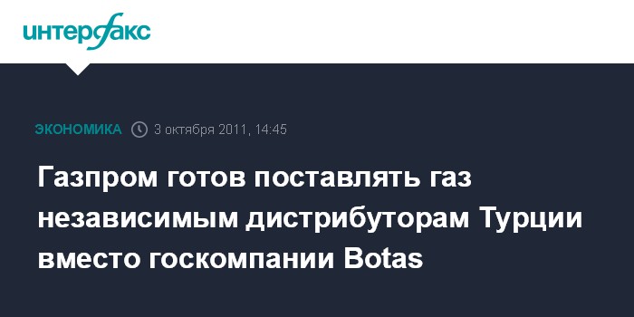Москва. 3 октября. INTERFAX.RU - "Газпром" готов поставлять газ независимым дистрибуторам Турции, если национальная газовая компания Botas не будет продлевать свой контракт на поставку российского газа.