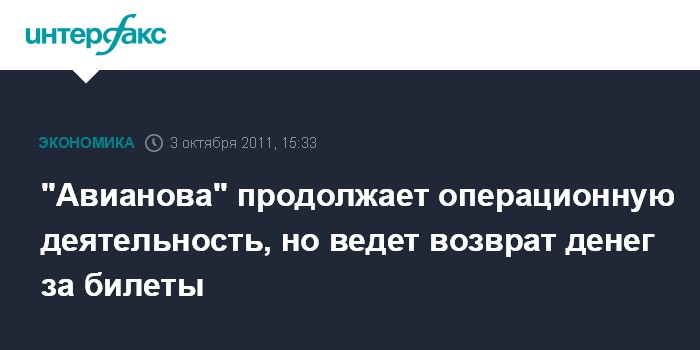 Москва. 3 октября. INTERFAX.RU - Компания "Авианова" заявила, что продолжает операционную деятельность для выполнения обязательств перед пассажирами.