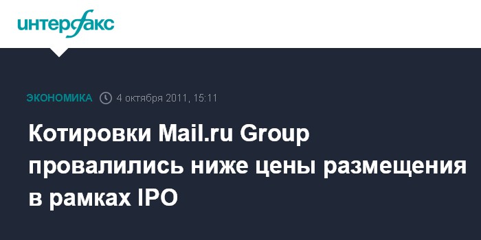 Москва. 4 октября. INTERFAX.RU - Капитализация интернет-компании Mail.ru Group Ltd. во вторник впервые упала ниже цены размещения в рамках прошлогоднего IPO на фоне продолжающегося снижения мировых финансовых рынков.